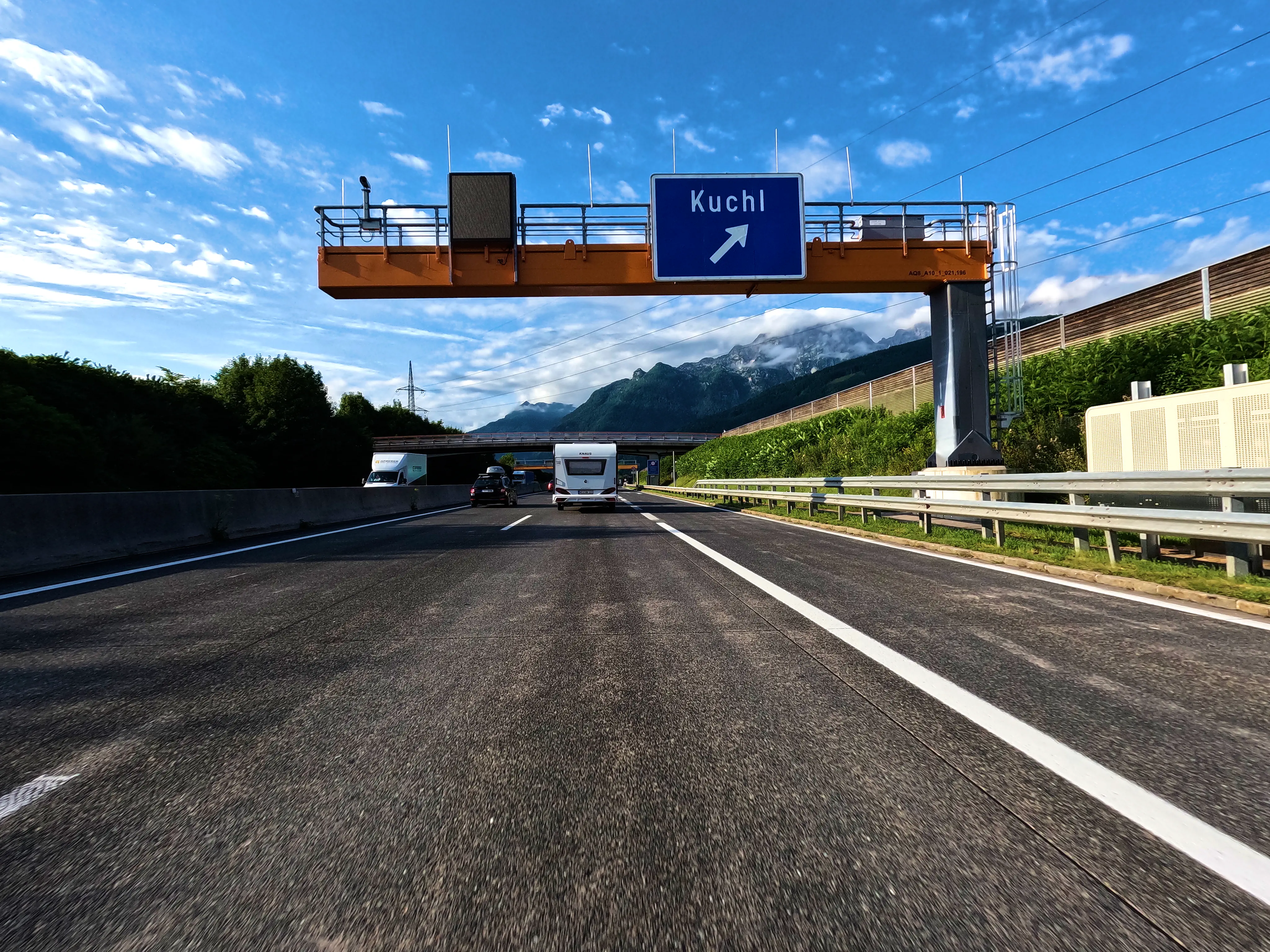 Ich entschied mich bei der Zusammenstellung der Passknacker-Punkte für diese Tour dafür, den Weg bis zum ersten Zwischenziel so weit wie möglich über die Autobahn zu absolvieren. Es war Mittwoch, ich hatte Urlaub, allerdings abends noch einen Termin - daher schnell zum Ziel, dann entspannt zurück. Ich fuhr direkt auf die A99, wechselte auf die A8 und hielt immer Richtung Salzburg. Gegen 7 Uhr war ich am Irschenberg, wie immer ein herrlicher Anblick beim Blick Richtung Osten. Die Grenze nach Österreich überquerte ich um kurz vor 8 Uhr. Kurz darauf geriet ich auf der A10 Richtung Hallein in etwas zähen Verkehr, nach wenigen Minuten ging es aber auch wieder flüssig weiter. Die Autobahn verließ ich bei Kuchl, wo ich, wie immer in Österreich, etwas von der Beschilderung verwirrt war - die Schilder hinterlassen immer kurz den Eindruck, als dürfte man hier nicht die Autobahn verlassen.
